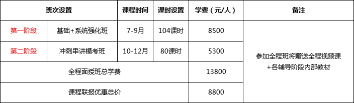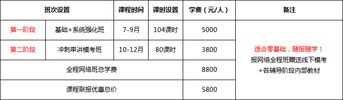 基礎(chǔ)班:循序漸進,理清各科考點;夯實基礎(chǔ),做到溫故知新; 穩(wěn)扎穩(wěn)打,構(gòu)建思維模式;透析考點,形成學習體系。系統(tǒng)班:全面復習,強化技巧;系統(tǒng)歸納,總結(jié)考點;結(jié)合真題,重點突破;運用技巧,快速解題。??即v班:突破重點題型,查漏補缺;體驗全真考場,調(diào)整心態(tài);分配答題時間,有的放矢;模擬強化訓練,總結(jié)規(guī)律;把握命題規(guī)律,預測考向考點歸納總結(jié),查漏補缺;預測命題態(tài)勢,輕松上陣。報全程面授班:基礎(chǔ)班+系統(tǒng)強化班+沖刺串講模考班=13800元/生。7月13日前報班享特大優(yōu)惠價8800元/人(贈送價值5800元全程視頻課+各輔導階段內(nèi)部資料)。1、報全程網(wǎng)絡(luò)班:基礎(chǔ)班+系統(tǒng)強化班+精講模串班=8800元。7月13日前報班享受特大優(yōu)惠價5800元/人。2、報網(wǎng)絡(luò)班送:贈送???各輔導階段內(nèi)部資料。3、網(wǎng)絡(luò)視頻課針對沒有時間參加面授班學員,手機、電腦下載APP可自由安排時間學習,費用低,效率高。