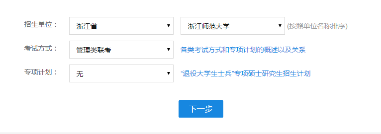 選擇了其中某個(gè)報(bào)考單位后,頁(yè)面長(zhǎng)這樣(以浙江師范大學(xué)為例):